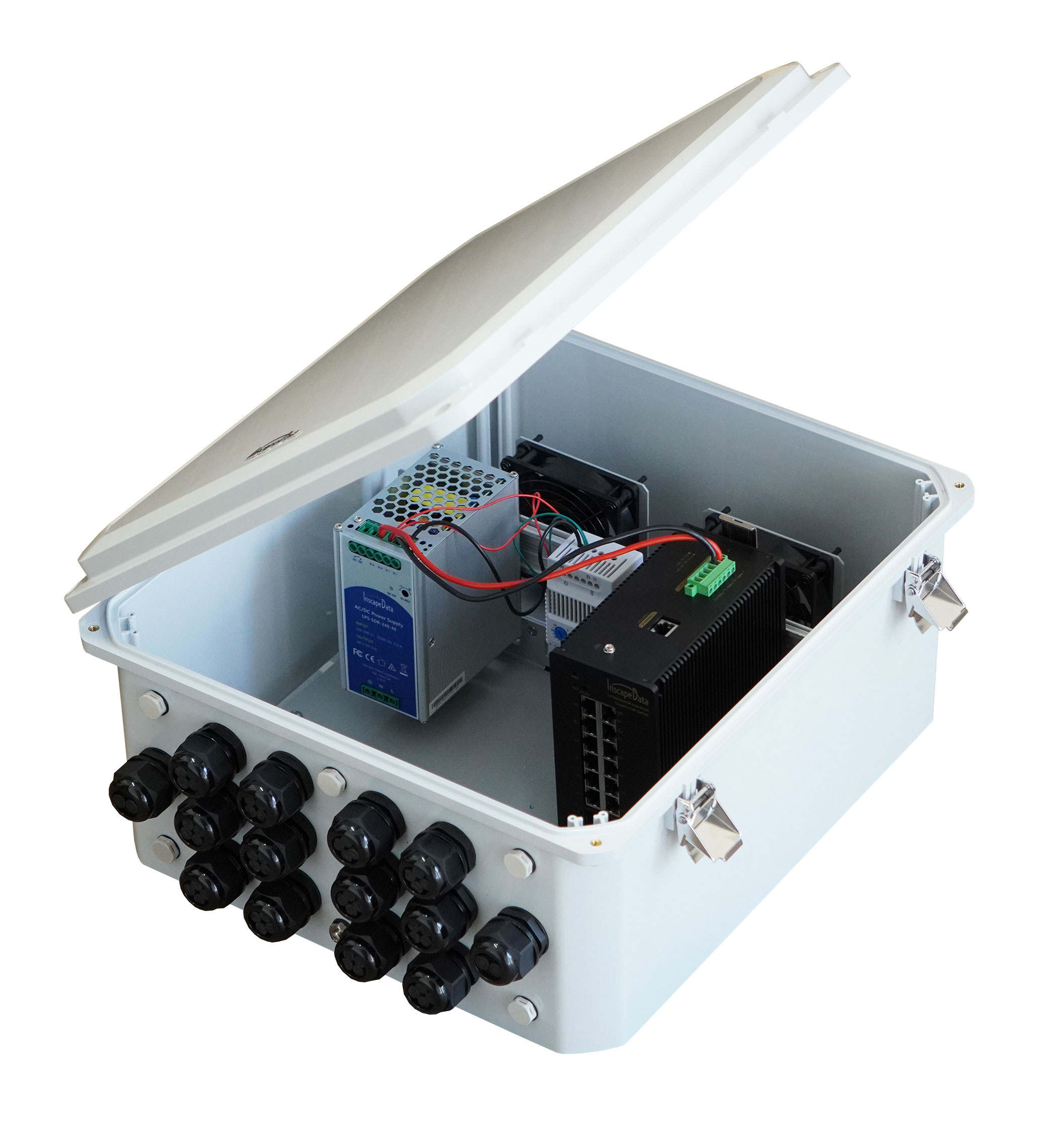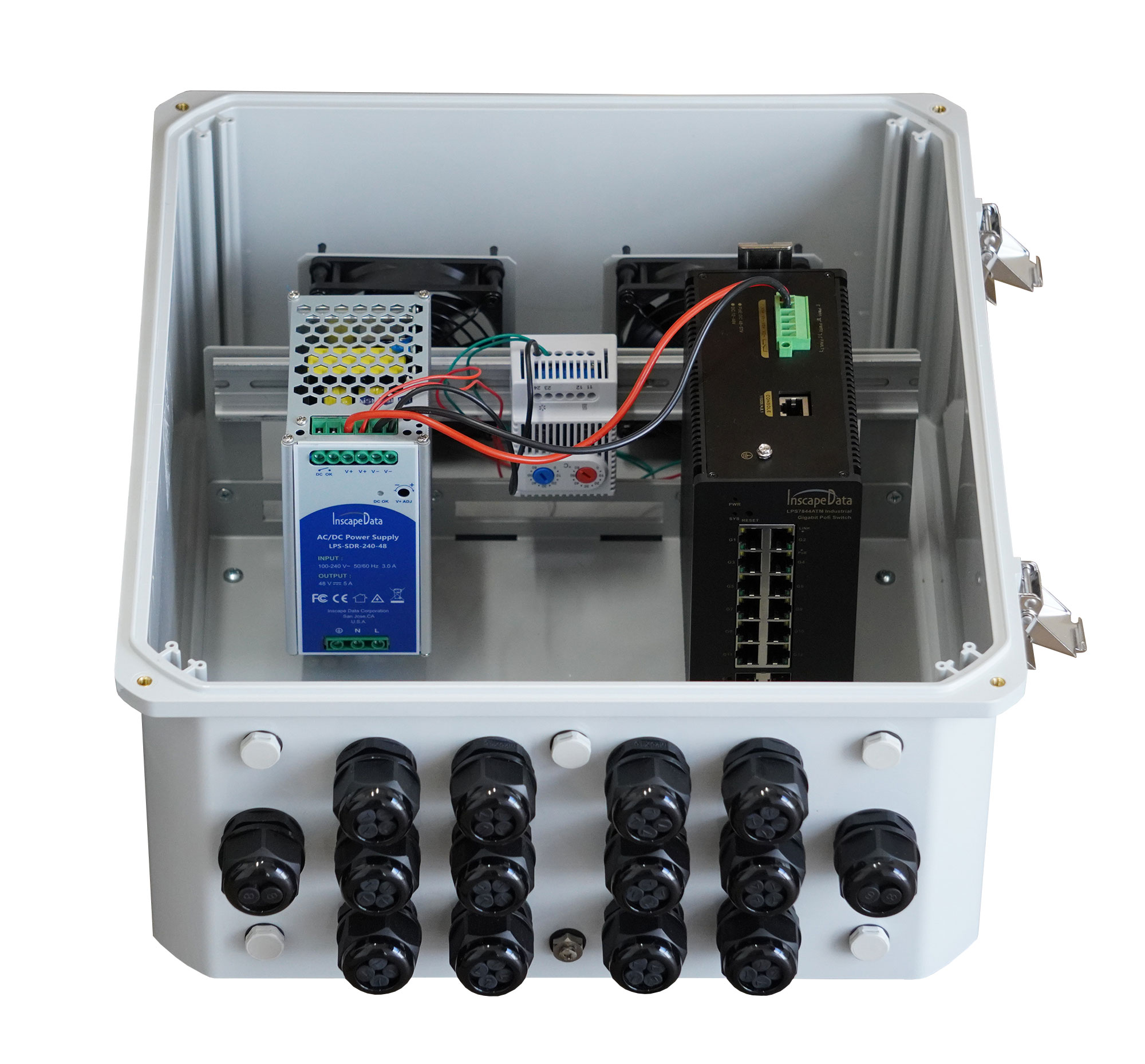 The LinkPower™ LPS8000DRG features Inscape Data's patented All-in-One Box outdoor enclosure design, providing durability and protection in harsh conditions. Equipped with a thermostat and two fans, this IP68 rated enclosure ensures optimal performance.