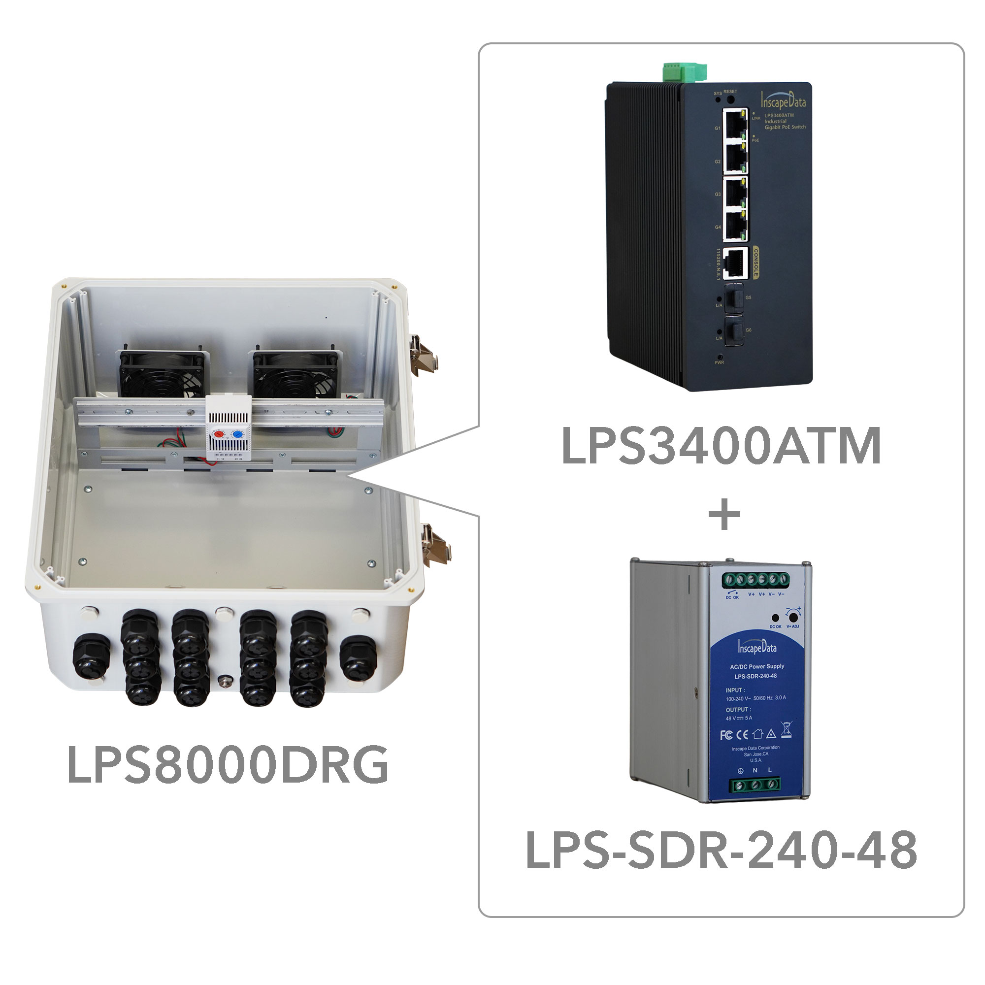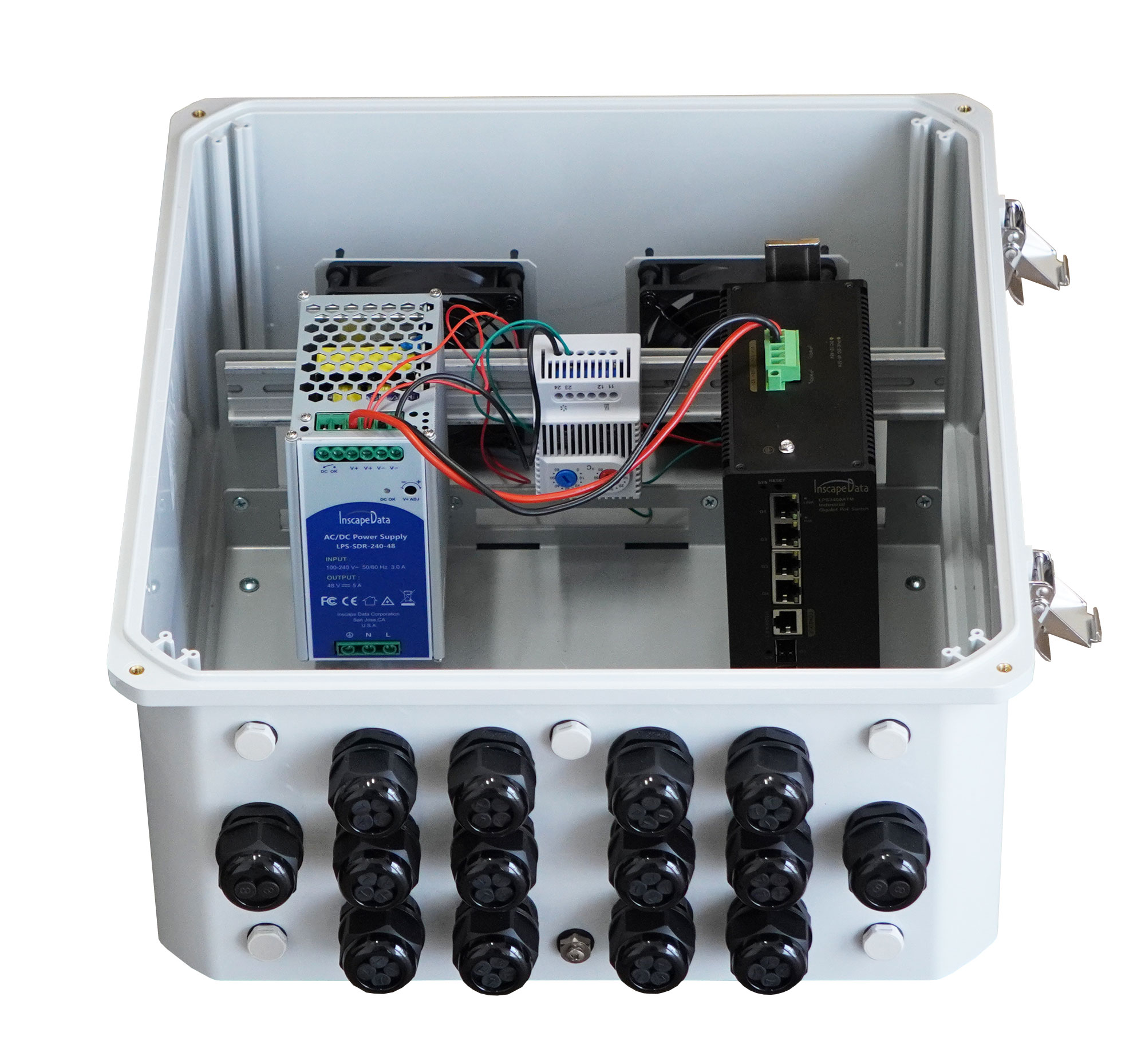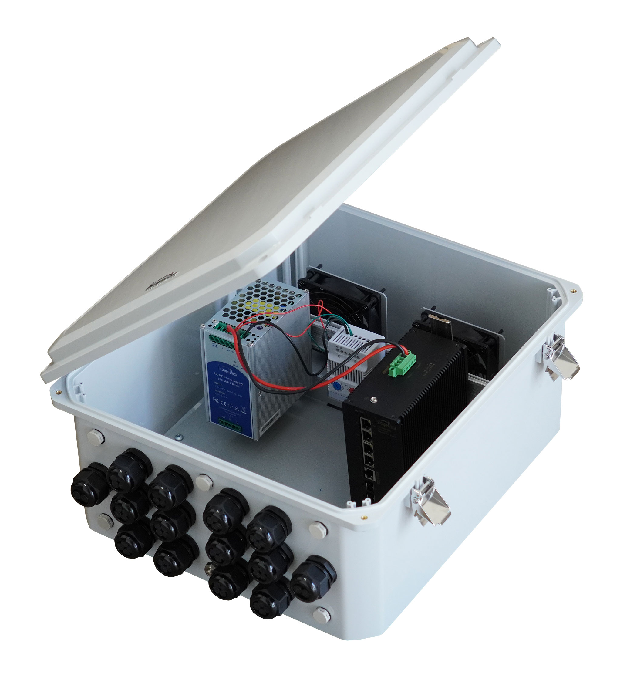 The LinkPower™ LPS8000DRG features Inscape Data's patented All-in-One Box outdoor enclosure design, providing durability and protection in harsh conditions. Equipped with a thermostat and two fans, this IP68 rated enclosure ensures optimal performance.